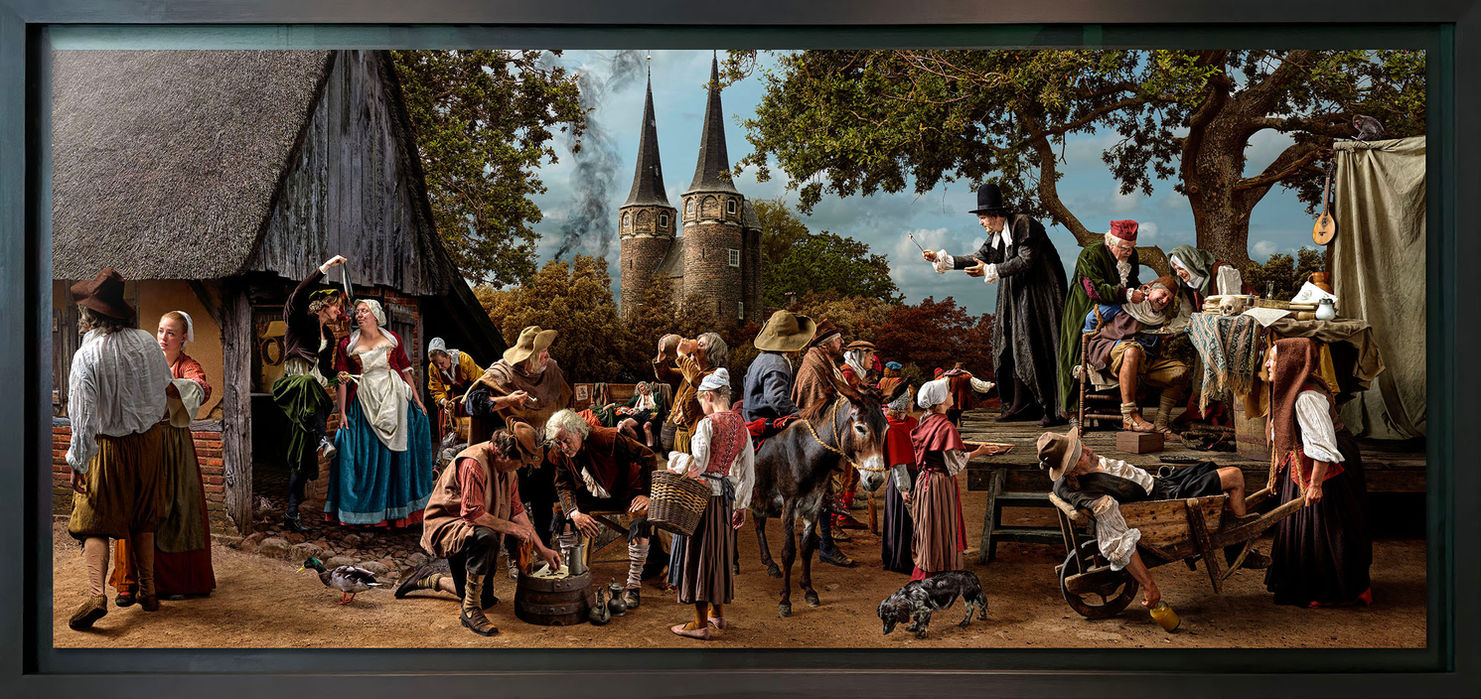 Meesters uit de 17e eeuw door mensen uit de 21ste eeuw De werken van de wereldberoemde Hollandse Meesters Rembrandt, Johannes Vermeer, Jan Steen, Vincent van Gogh en Mondriaan komen op een fascinerende manier samen in dit grootse project van kunstenaar Julius Rooymans, bekend van de productie ‘Nachtwacht360’. De grote fotografische werken zijn mogelijk gemaakt door de bijzondere samenwerking met het AFAS theater. Dankzij medewerking van gerenommeerde instituten als Museum Vrolik, Het Rembrandthuis, Allard Pierson en bekende verzamelaars en antiquairs zijn er talrijke historische en originele voorwerpen als serviezen, wapens en decors te zien op de fotografische werken. Geholpen door de expertise en tomeloze toewijding van vakmensen als meester-grimeur Arjen van der Grijn, kostuumontwerpster Catherine Cuykens, kunsthistoricus Marieke de Winkel zijn sieraden, haarwerken en kleding historisch kloppend gemaakt tot in de kleinste details. Techniek en figuranten uit de 21ste eeuw wekken de kunstwerken uit de 17e en 19e eeuw verder tot leven.