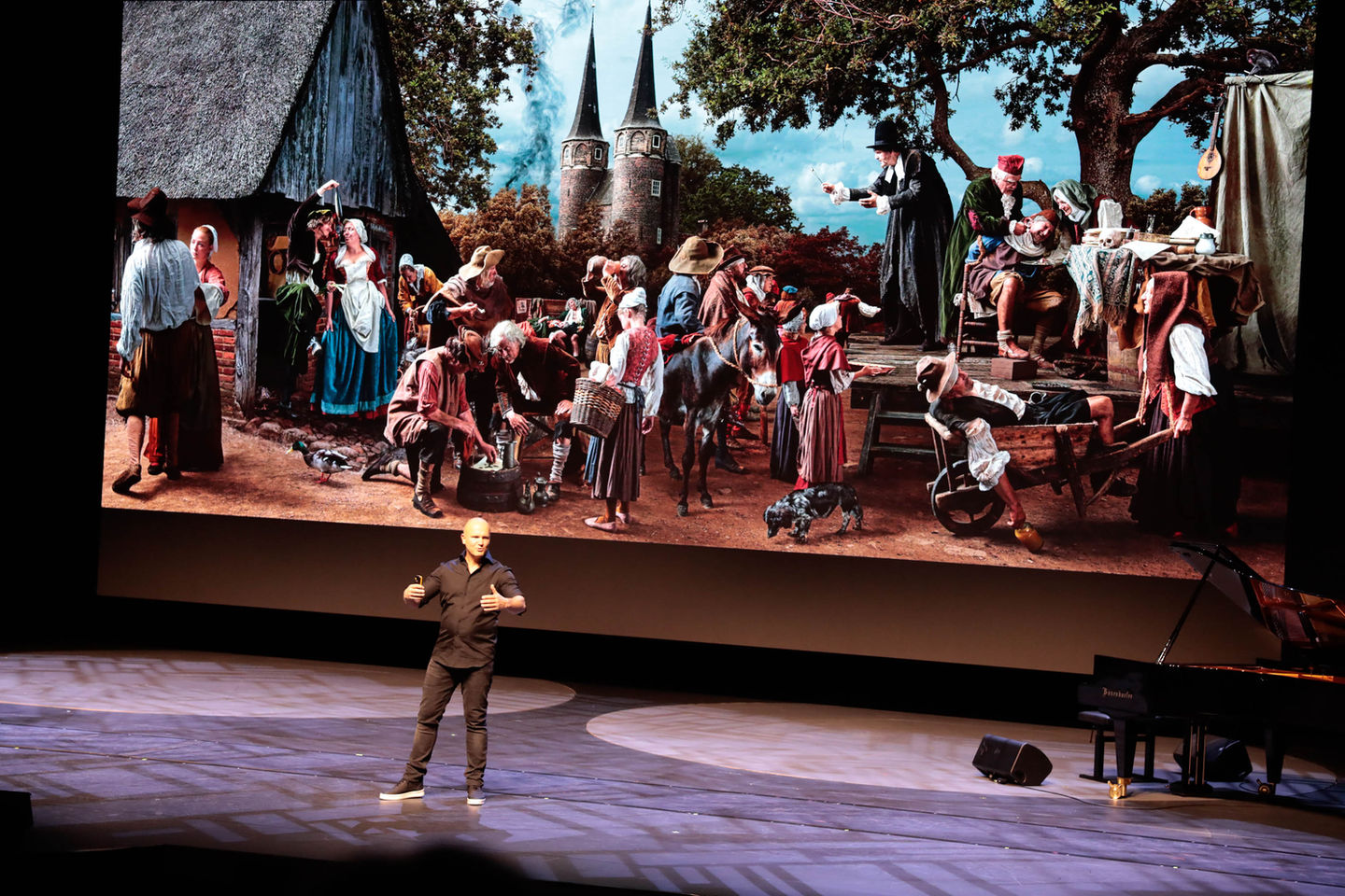 De werken van de wereldberoemde Hollandse Meesters Rembrandt, Johannes Vermeer, Jan Steen, Vincent van Gogh en Mondriaan komen op een fascinerende manier samen in dit grootse project van kunstenaar Julius Rooymans, bekend van de productie ‘Nachtwacht360’. De grote fotografische werken zijn mogelijk gemaakt door de bijzondere samenwerking met het AFAS theater.